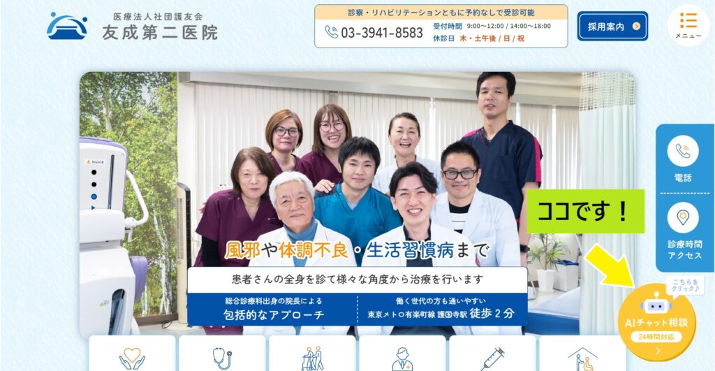 ① 当院ホームページにアクセスする 画面右下に「AIチャット相談」のボタンが表示されています。